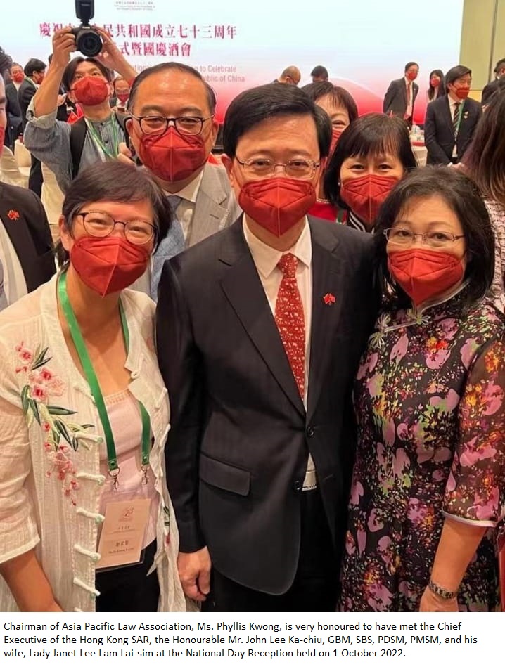 Chairman of Asia Pacific Law Association, Ms. Phyllis Kwong, is very honoured to have met the Chief Executive of the Hong Kong SAR, the Honourable Mr. John Lee Ka-chiu, GBM, SBS, PDSM, PMSM, and his wife, Lady Janet Lee Lam Lai-sim at the National Day Reception held on 1 October 2022.