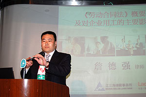 | 上海勞動法專家來港訪問演講 (2008年4月8-9日) 2008年4月8日,亞太法律協會與生產力促進局合辦《勞動合同法》講座。上午十時半至十二時半在生產力促進局大樓四樓展覽廳舉行,與會者約200人,主要為珠三角港中小企及物流業界人員。本會榮幸邀請上海江三角律師事務所專職律師詹德強先生主講,上海江三角律師事務所首席合伙人陸鏡波律師一同解答提問。講座內容包括1. 新舊勞動合同法的差別比較;2. 新勞動合同法對勞資關係的影響;3. 目前勞動合同法執行細則的制訂情況;及4. 香港企業應對策略。問答環節反應非常踴躍,與會者十分關心在新勞動法中如何保障資方的權益,免墮陷阱,提出很多具體問題:如新舊合同如何過渡安排;如何糾正過往不合標準的做法;與員工私下訂立協議的效力;佣金、花紅、獎金是否算作工資;廠房搬遷要如何安置員工;員工主動提出買斷工齡或不參與社保是否合法等等。講座結束後兩位律師在台下繼續解答聽眾的疑問。 |